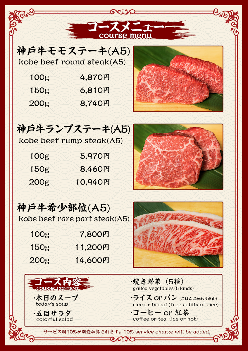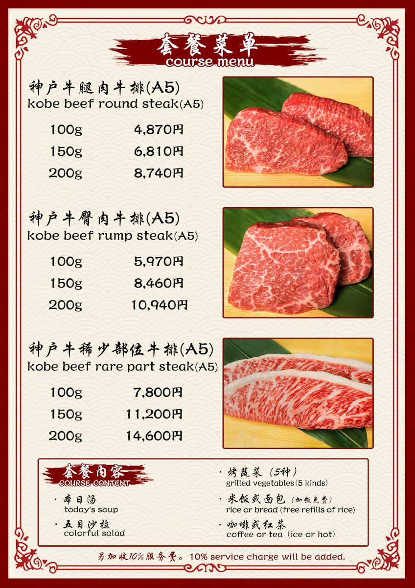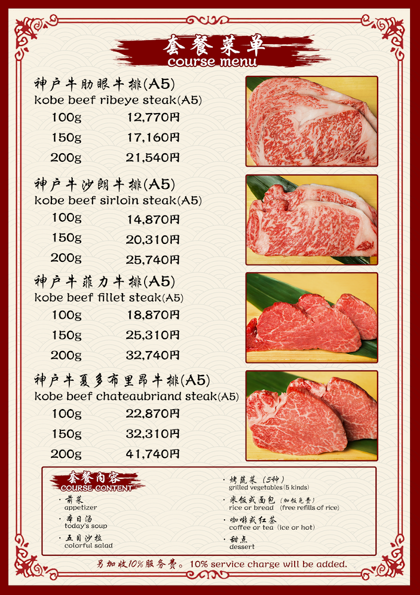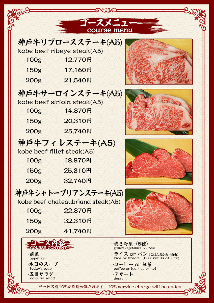 The menu at Kobe Beef Steak Kiku神戸牛ステーキ菊 offers a truly exceptional dining experience with a focus on high-quality ingredients, especially the famous Kobe beef. The star of the menu is, without a doubt, the Kobe beef steak, served in various cuts, each prepared to perfection and full of rich, melt-in-your-mouth flavor. Accompanying the steak are several well-thought-out sides, such as fresh and crunchy 沙拉, which provides a crisp contrast to the savory beef. The meal can be rounded off with a delightful 甜點, offering a sweet end to an indulgent dining experience. For those looking to complement their meal, the restaurant offers a variety of Tea, carefully selected to pair well with the richness of the beef. With its refined selection of dishes, Kobe Beef Steak Kiku ensures that every aspect of the meal is a memorable one, from the carefully prepared Kobe beef to the simple yet elegant accompaniments.