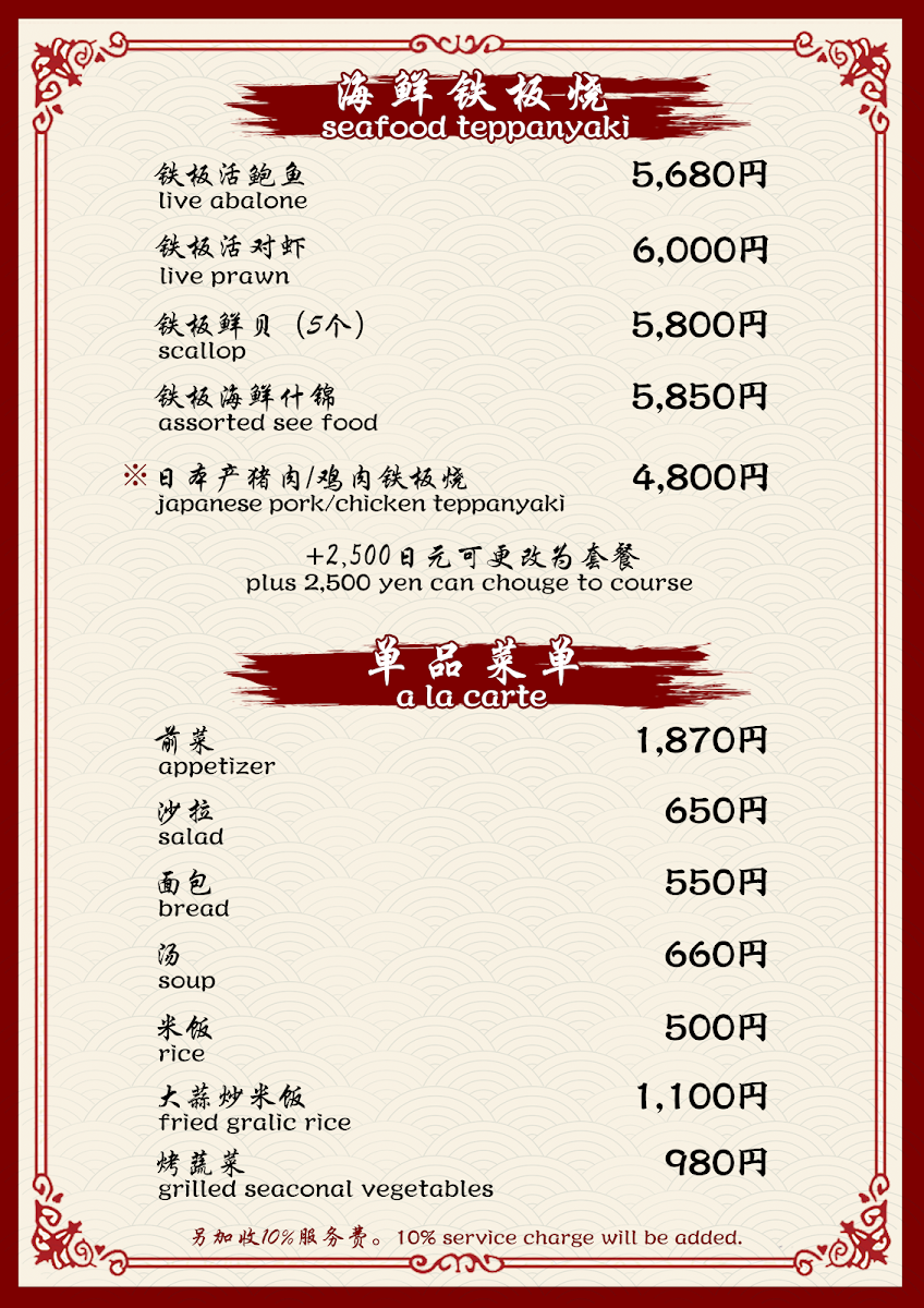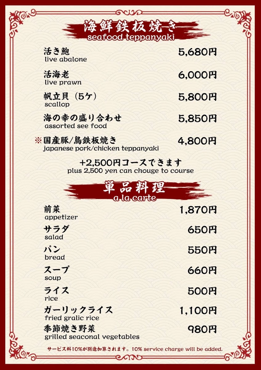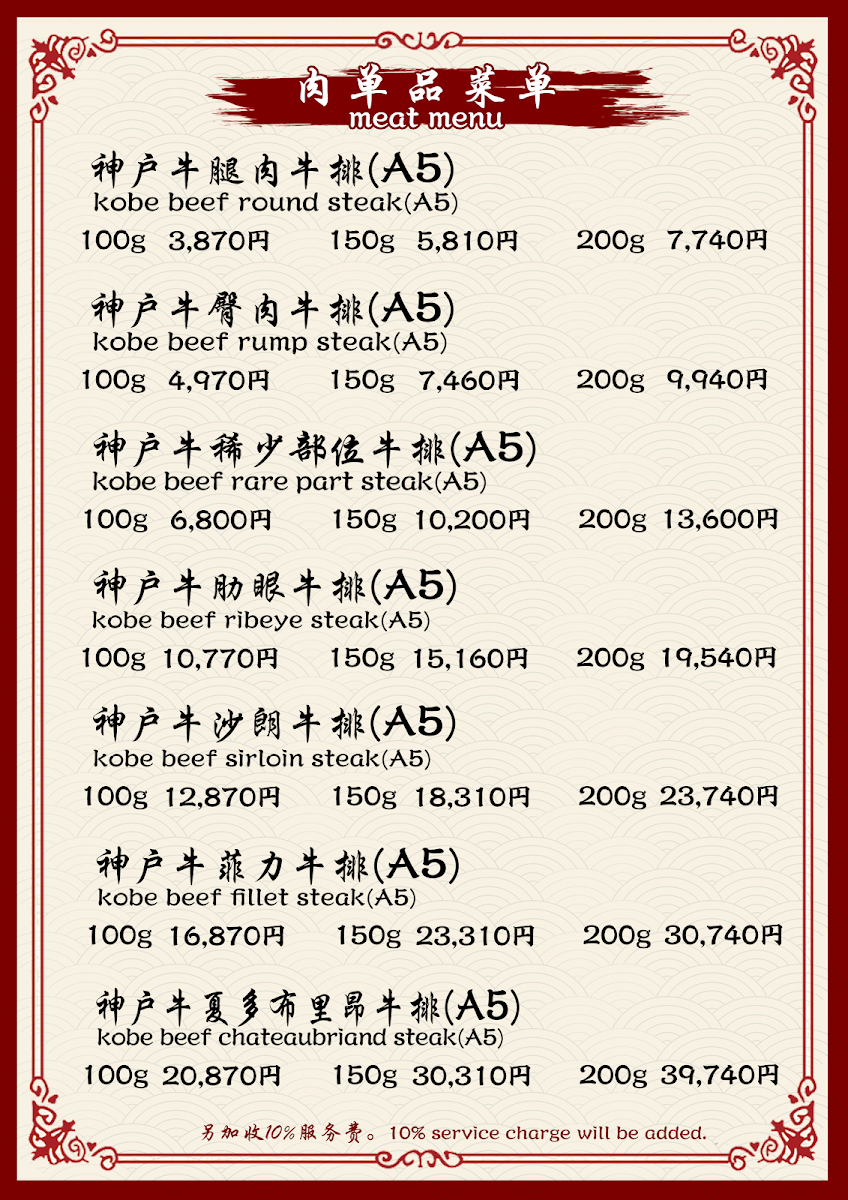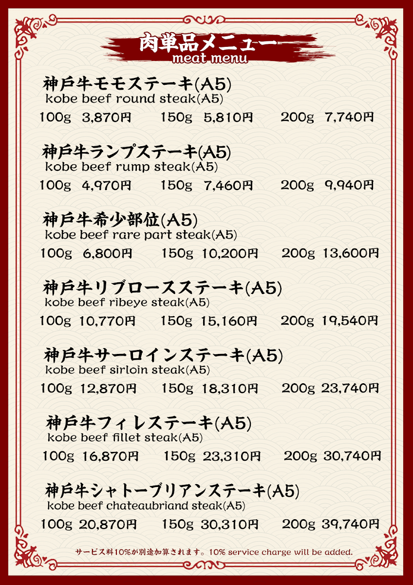 The menu at Kobe Beef Steak Kiku神戸牛ステーキ菊 offers a truly exceptional dining experience with a focus on high-quality ingredients, especially the famous Kobe beef. The star of the menu is, without a doubt, the Kobe beef steak, served in various cuts, each prepared to perfection and full of rich, melt-in-your-mouth flavor. Accompanying the steak are several well-thought-out sides, such as fresh and crunchy 沙拉, which provides a crisp contrast to the savory beef. The meal can be rounded off with a delightful 甜點, offering a sweet end to an indulgent dining experience. For those looking to complement their meal, the restaurant offers a variety of Tea, carefully selected to pair well with the richness of the beef. With its refined selection of dishes, Kobe Beef Steak Kiku ensures that every aspect of the meal is a memorable one, from the carefully prepared Kobe beef to the simple yet elegant accompaniments.